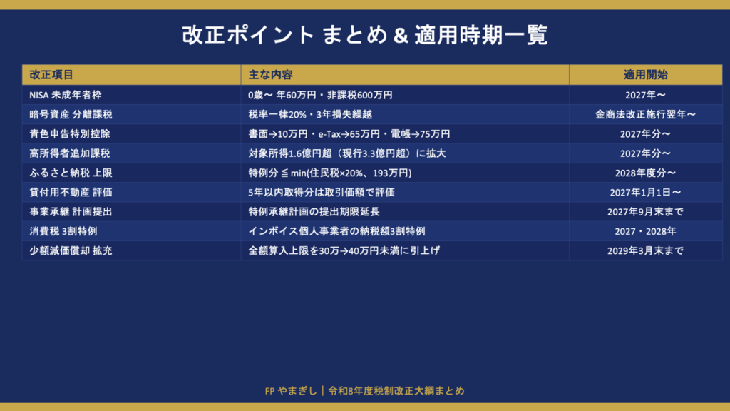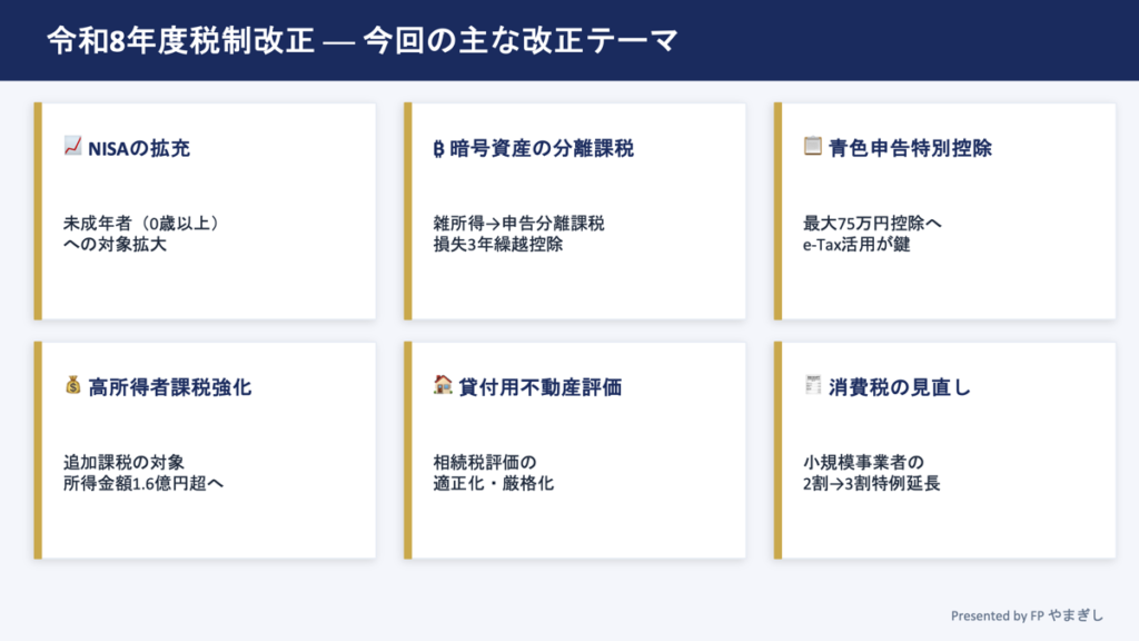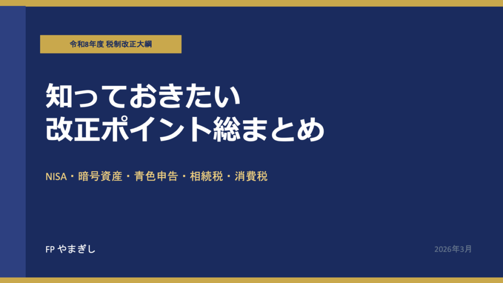 続・令和8年度の税制改正についてまとめてみました。講義用のパワーポイントを使用してご案内いたします。 投稿日 2026年3月28日 著者 fp.yamagishi カテゴリー 税金 この記事を書いた人 fp.yamagishi 金融機関に勤務しながら、副業でファイナンシャル・プランナーをしています。大学卒業後に金融機関に勤め、10年勤務した後、同業に転職。 25年以上の金融機関勤務経験を活かし、皆さんの資産運用・お金の問題を支援できましたらと考えています。 【資格】 ・ファイナンシャルプランナー(CFP) ・FP技能検定1級取得 ・貸金業取扱主任者 記事一覧 ウェブサイト